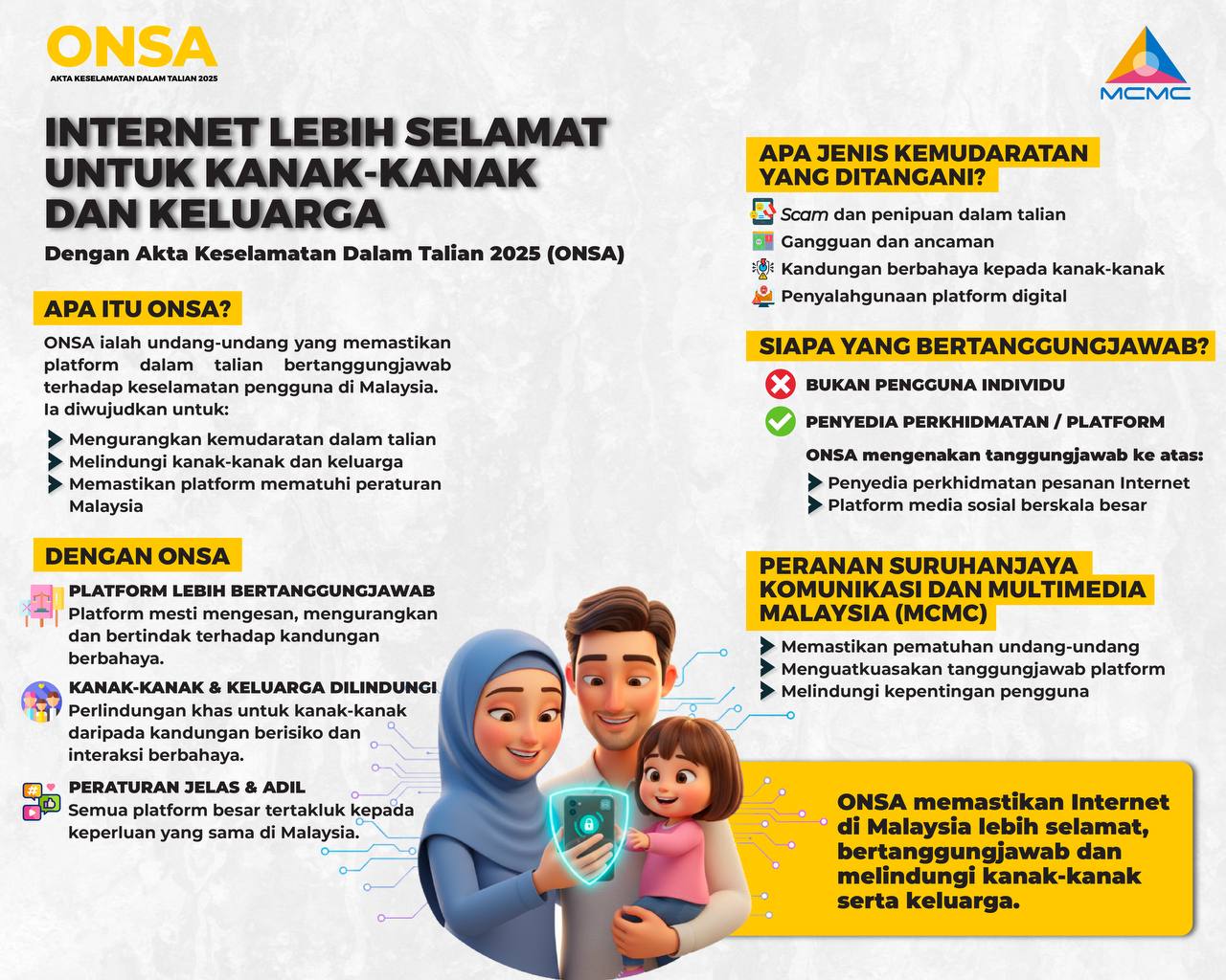 Akta Keselamatan Dalam Talian 2025 (ONSA) memperkukuh tanggungjawab platform digital demi keselamatan pengguna. Perlindungan kanak-kanak diutamakan, kandungan memudaratkan wajib ditangani. Keselamatan dalam talian bukan pilihan, ia tanggungjawab bersama. Maklumat lanjut mengenai ONSA boleh didapati di laman sesawang MCMC disini